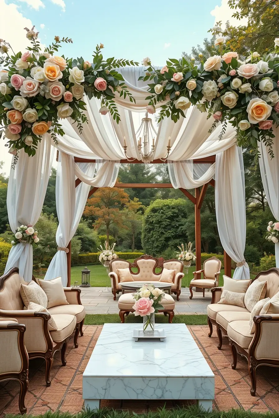 To complete the setting, I recommend adding light draped fabric canopies, outdoor lanterns, and large planters with tropical plants such as palms or bird-of-paradise. These elements create a layered environment that feels luxurious, creative, and truly unique.