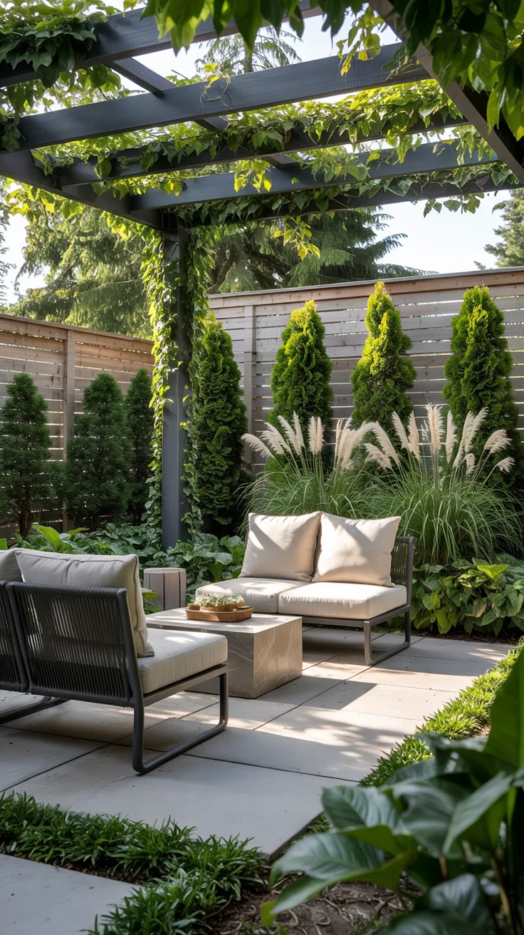 I carefully select modular living wall systems with built-in irrigation to ensure long-term plant health. For outdoor privacy screens, I prefer dense plantings such as ornamental grasses, ferns, climbing ivy, and flowering perennials arranged in layered panels. I integrate outdoor lounge furniture like weather-resistant sectionals, teak coffee tables, textured outdoor rugs, and ceramic planters to complement the greenery. Lighting, such as subtle LED strips along the frame, enhances usability at dusk while maintaining a calm ambiance.