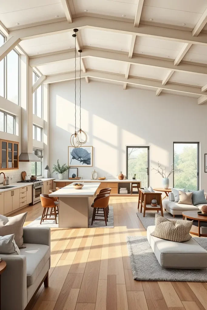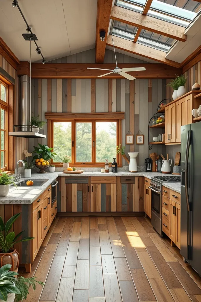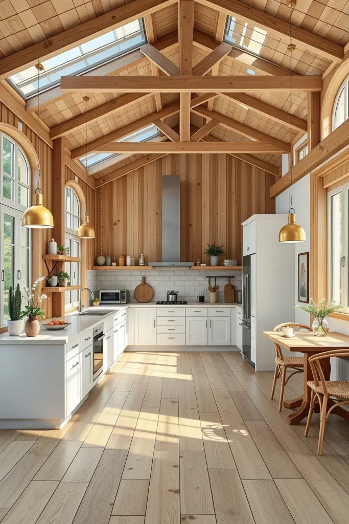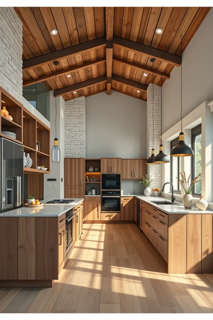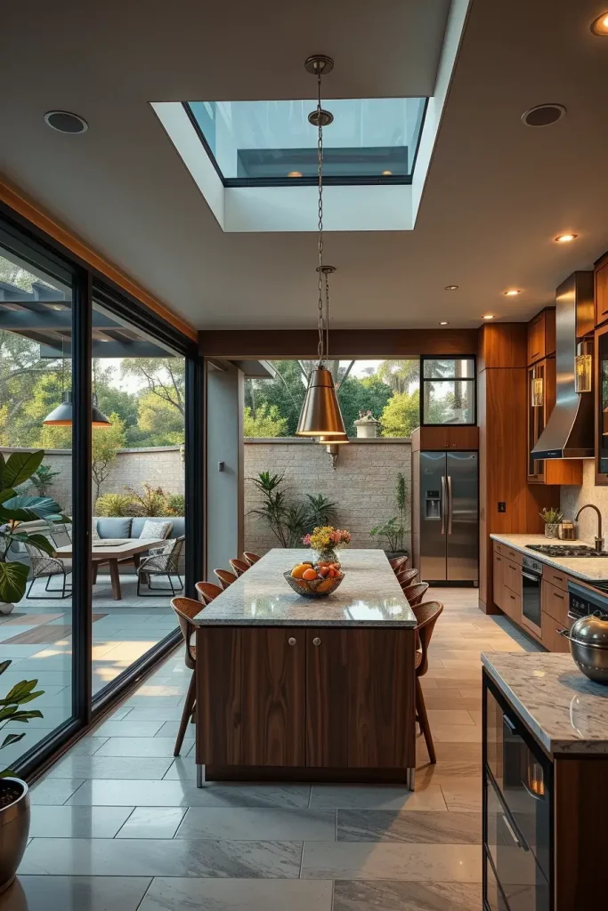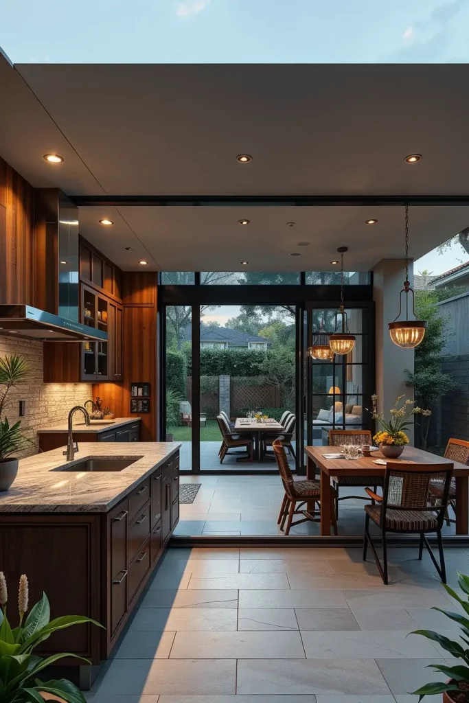 In the creation of such a kitchen, I would always include weatherproof material and finishes that can also easily blend between the interior and exterior. It must have durable wood cabinet, smooth stone countertops, and modern kitchen islands that also serve as stations outside. Waterproof comfortable seating and hidden storage make it comfortable and stylish. Lighting has significant role to play- I have layered fixtures, light sources that include both the natural skylights and ambient LED lights during the evening, to provide warmth.