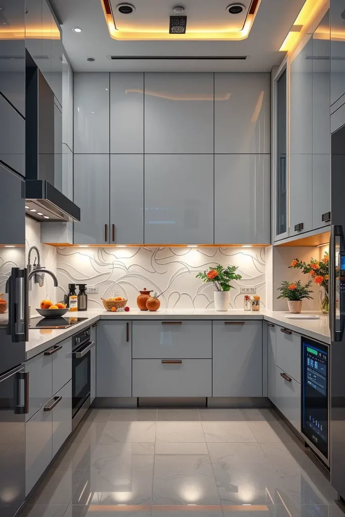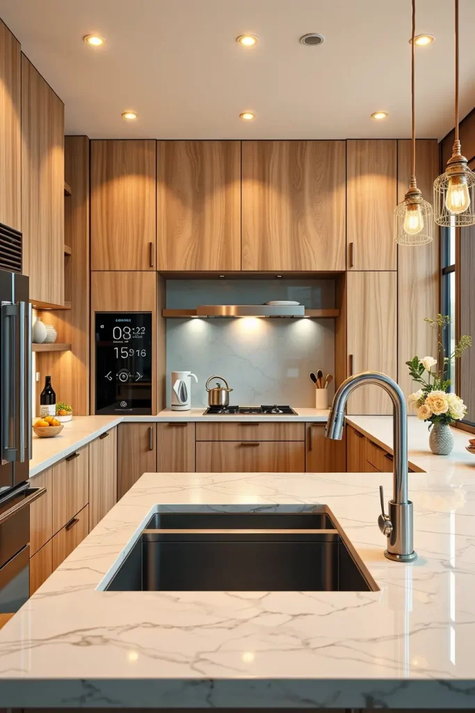 Some of the important features are the use of under-counter induction cooktops, voice activated lighting and digital control hubs which can be integrated into the smart homes. Touchless faucets, as well as built-in charging, improve the user experience, and the surfaces remain smooth.