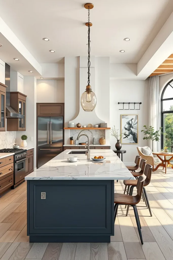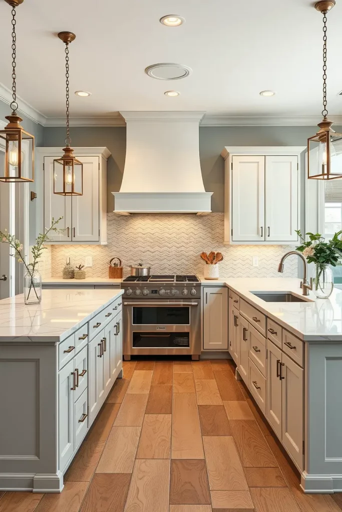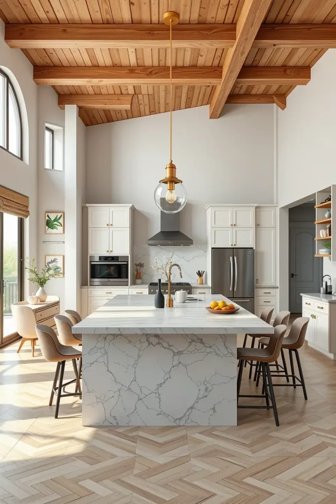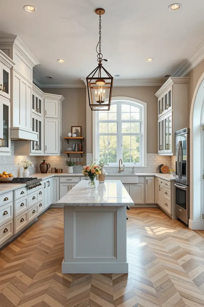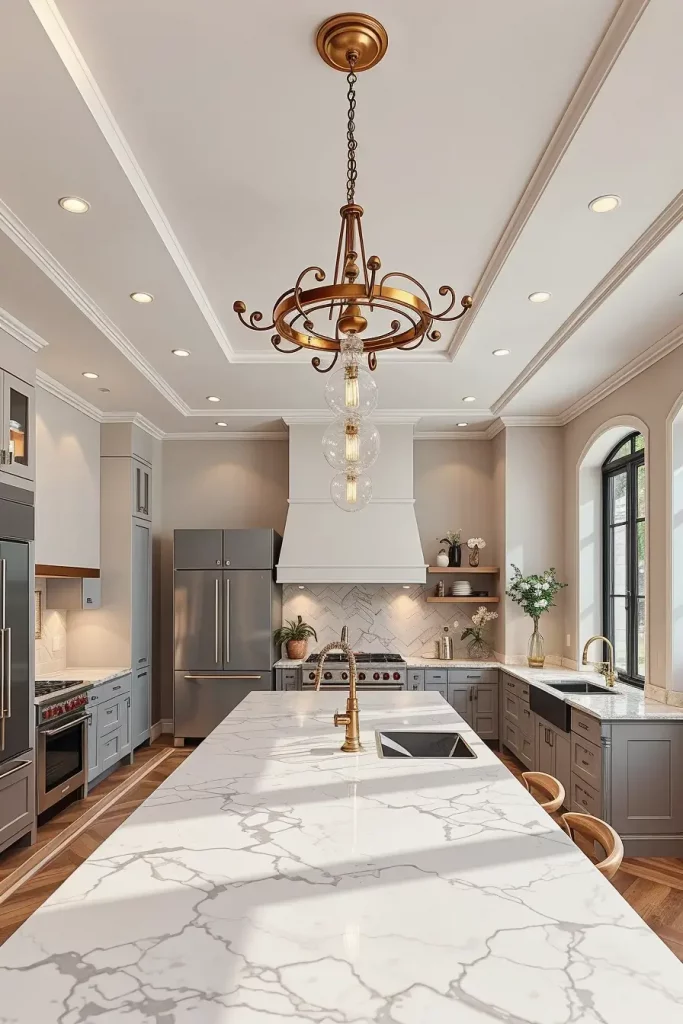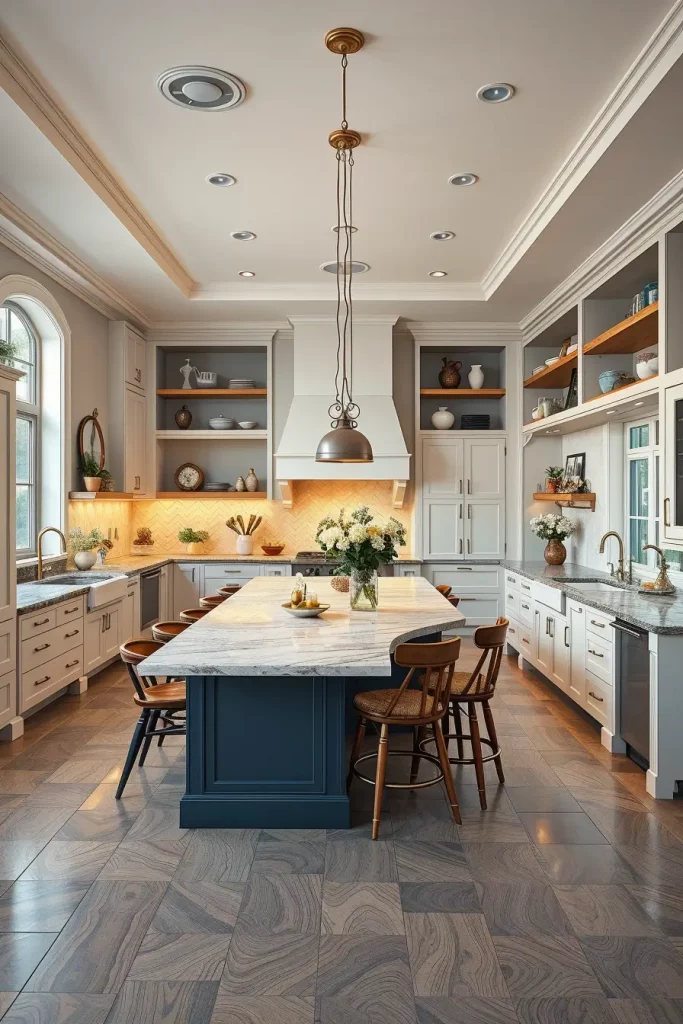 My favourite is shaker-style cabinets with smooth metal handles and neutral quartz counter-tops. A big island usually turns out to be the center stage, to which storage, preparation, and a place to eat casually can be directed. Old fashioned lighting such as lantern pendants will give a bit of the old fashioned nature without dominating the new flow.