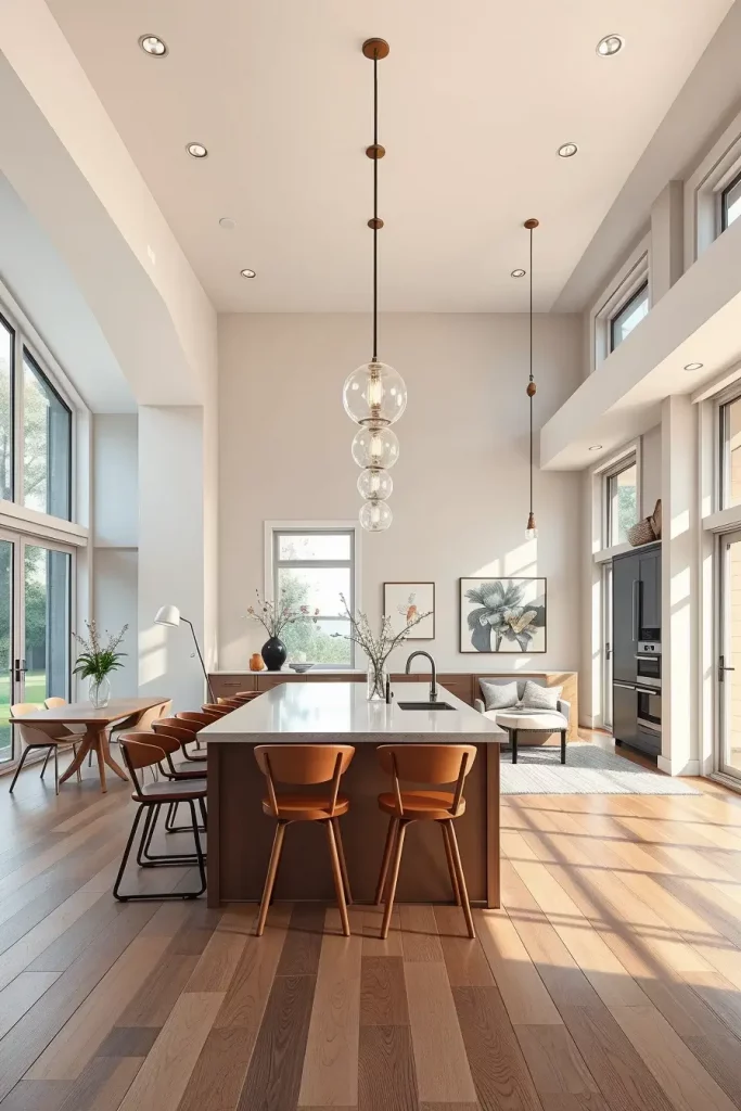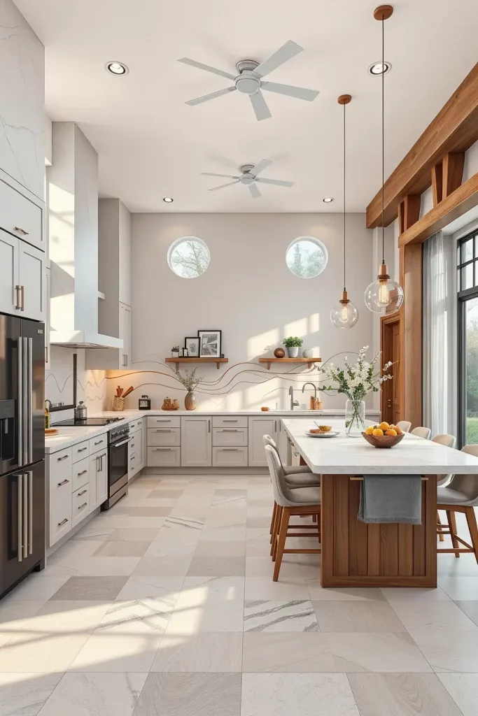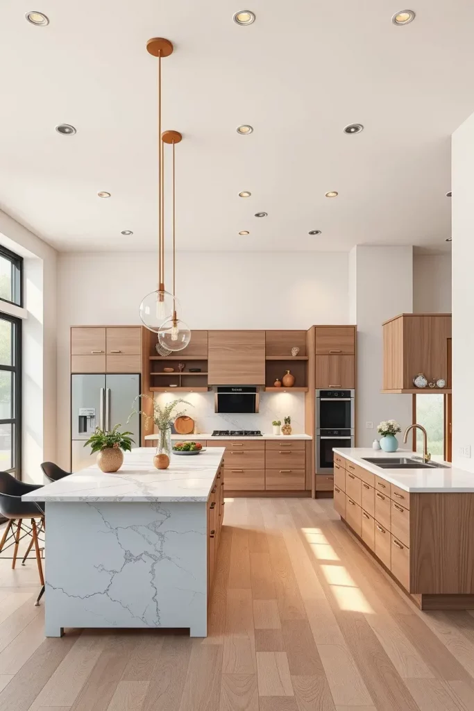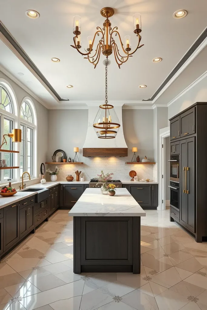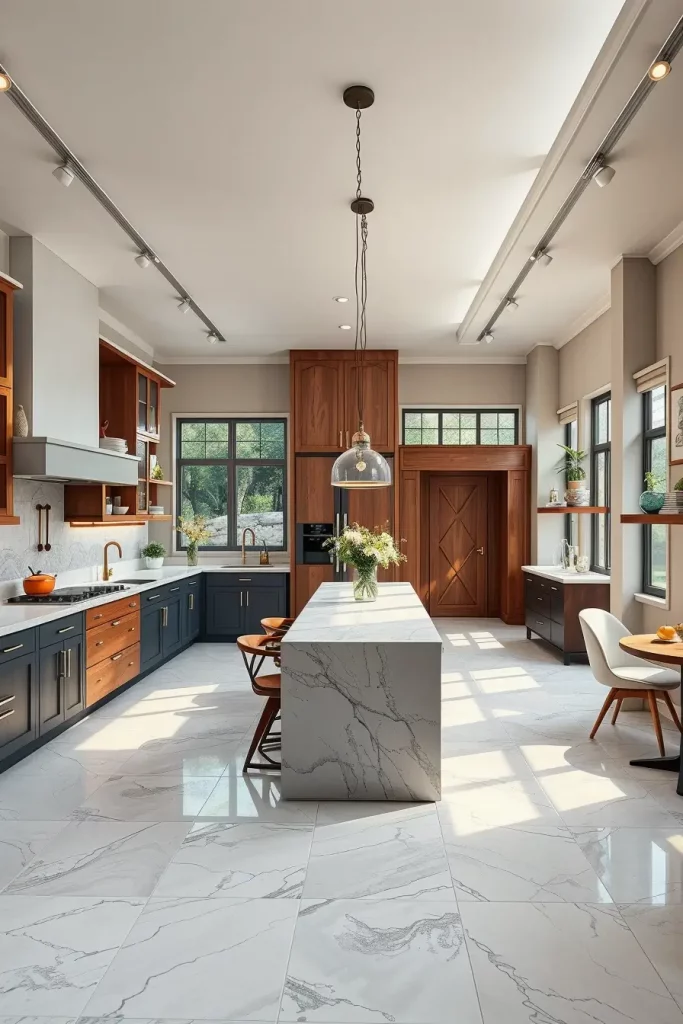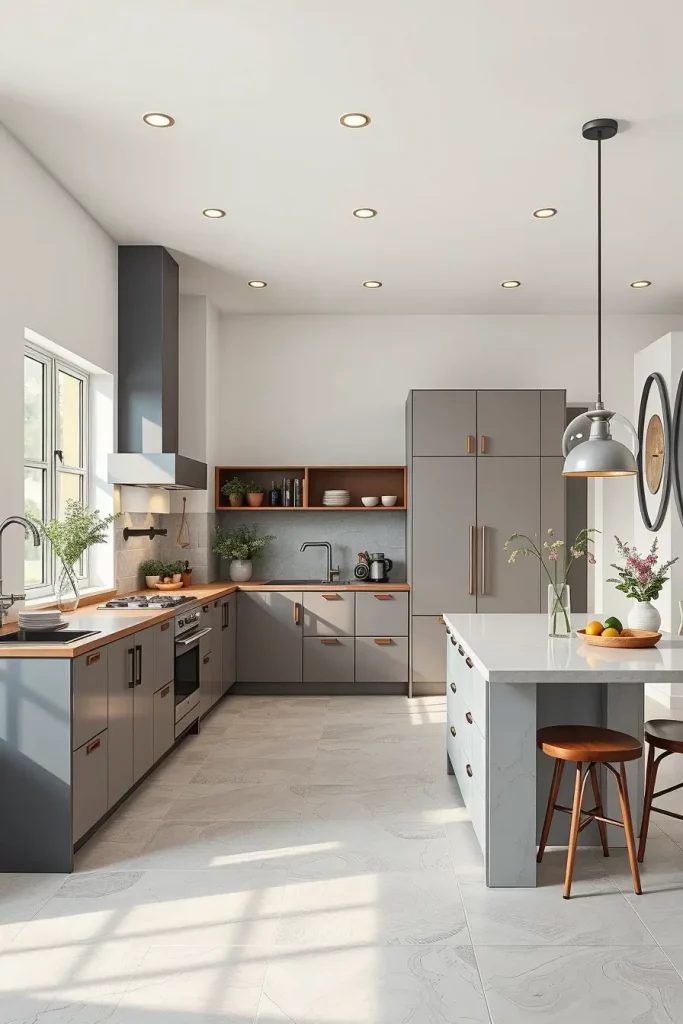 My favourite is shaker-style cabinets with smooth metal handles and neutral quartz counter-tops. A big island usually turns out to be the center stage, to which storage, preparation, and a place to eat casually can be directed. Old fashioned lighting such as lantern pendants will give a bit of the old fashioned nature without dominating the new flow.