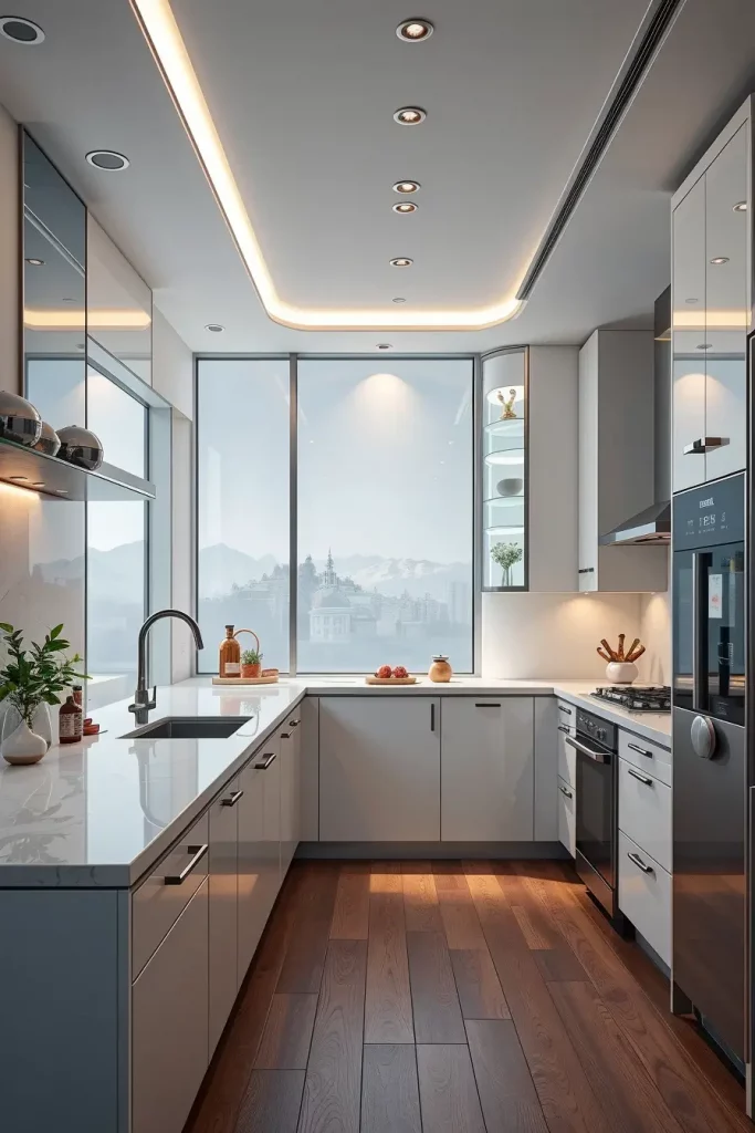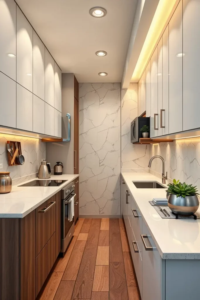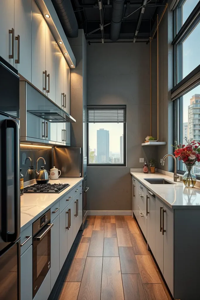 I usually create galley kitchens and have two parallel counters, one usage is cooking and the other preparation and cleaning. Such kitchens are functional and stylish with the use of smart lighting, sleek appliances, and smooth cabinetry. Cold palettes of minor metallic tones are ideal in this case.
