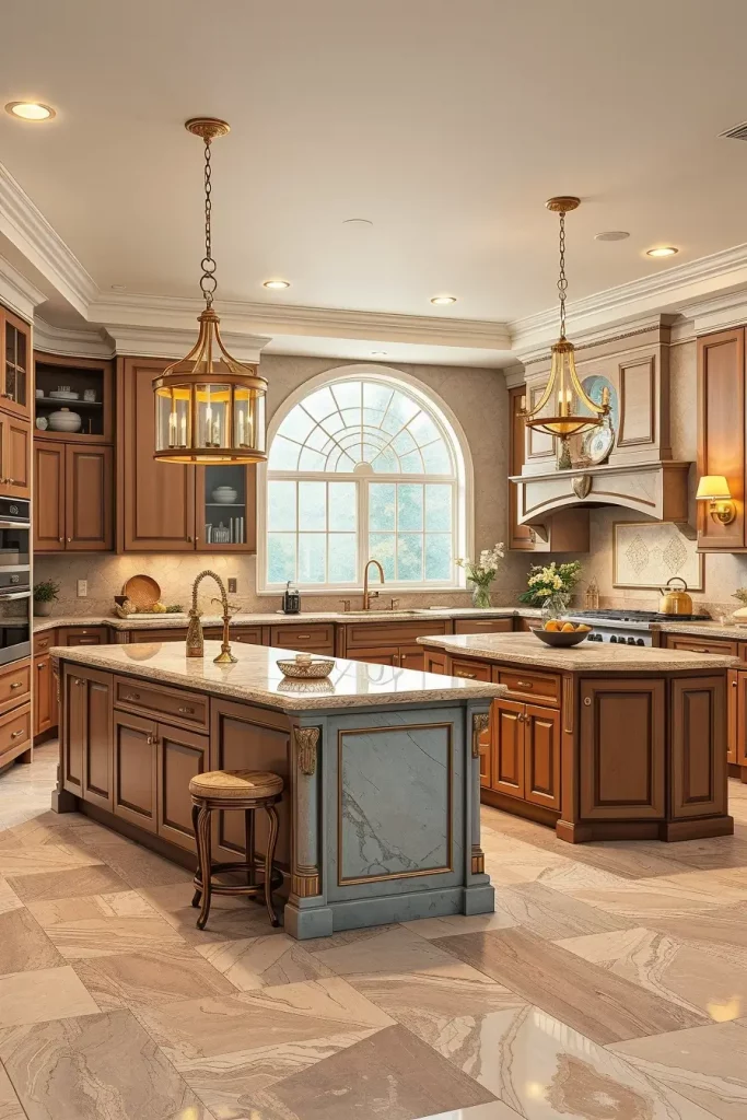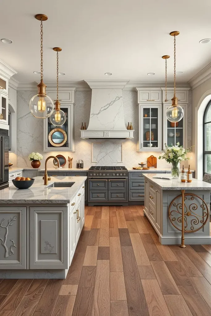 I usually prepare on one of the islands and dine or entertain on another. Natural stone, brushed brass, and fine wood accents make it sophisticated and use the high-end materials. There is visual symmetry and drama provided through the use of statement lighting fixtures over each island.