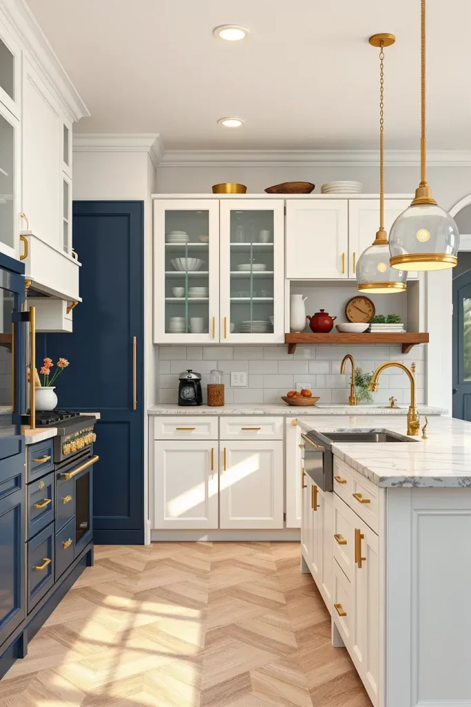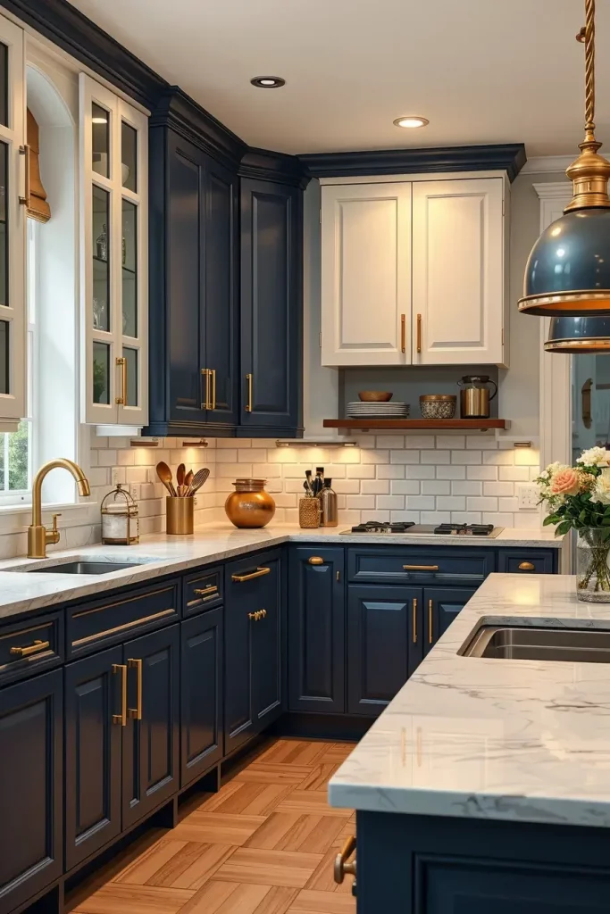 In instance, navy lower cabinets paired with white upper or natural oak and soft gray match to a very elegant look. The transition of color is well accentuated with gold or matte black hardware.