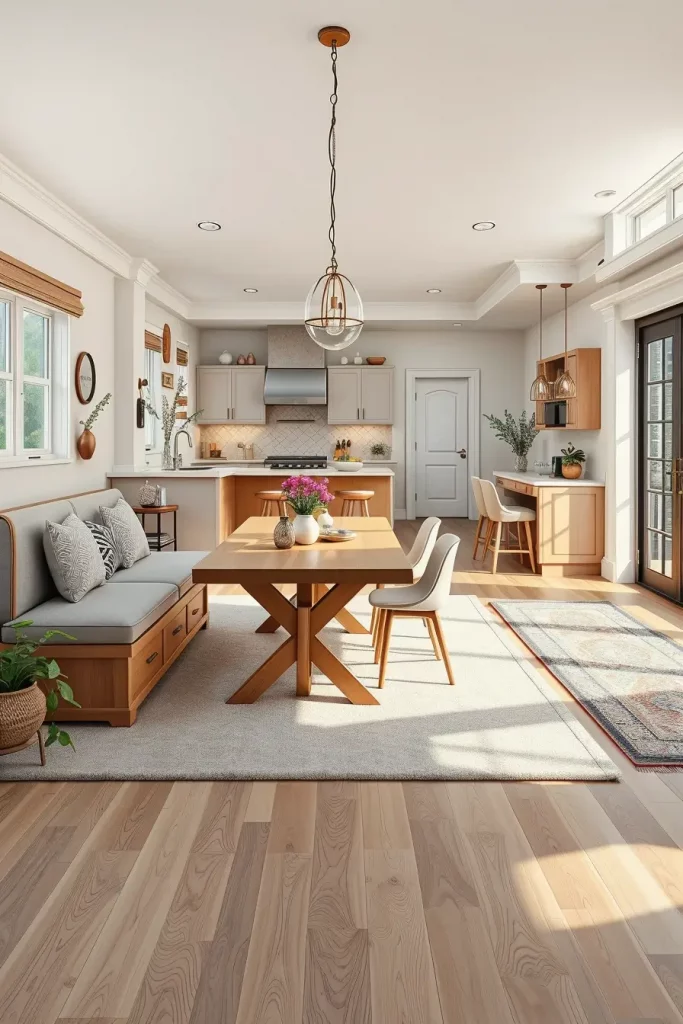 When coming up with such spaces, I incorporate the extendable dining tables, banquette and the use of pendant lights which join the kitchen and the dining space physically. The spaces are harmonized with neutral colors and the boundaries are determined with the help of decorative carpets underneath the dining set.