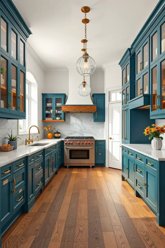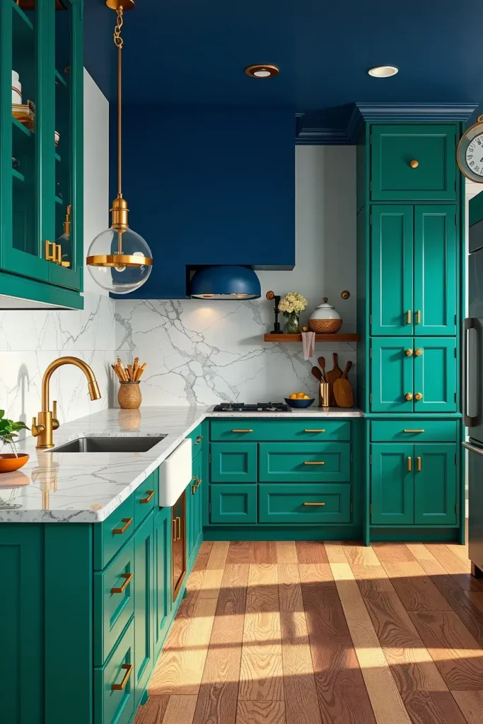 When I am designing these kitchens, I dwell on balance. As an example, bold cabinets would be very beautiful contrasted with light countertops, brass hardware, or natural stone back splashes. I usually combine rough surfaces such as brushed metal or marble to provide depth. The flooring is usually neutral, neither in light oak nor in pale porcelain, so that it does not overwhelm the eye.