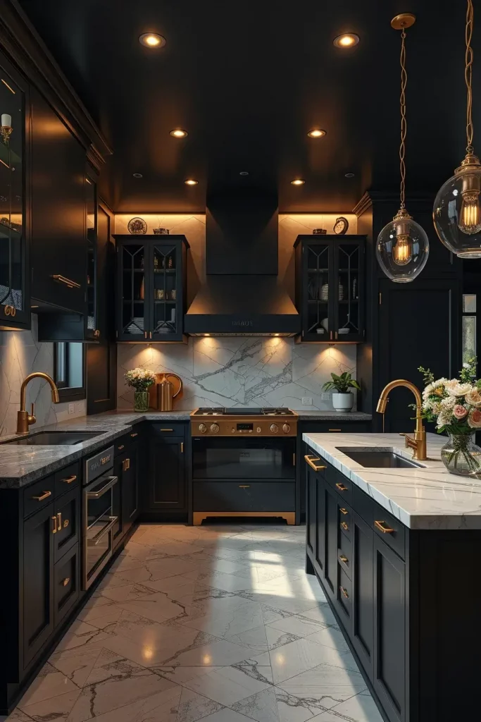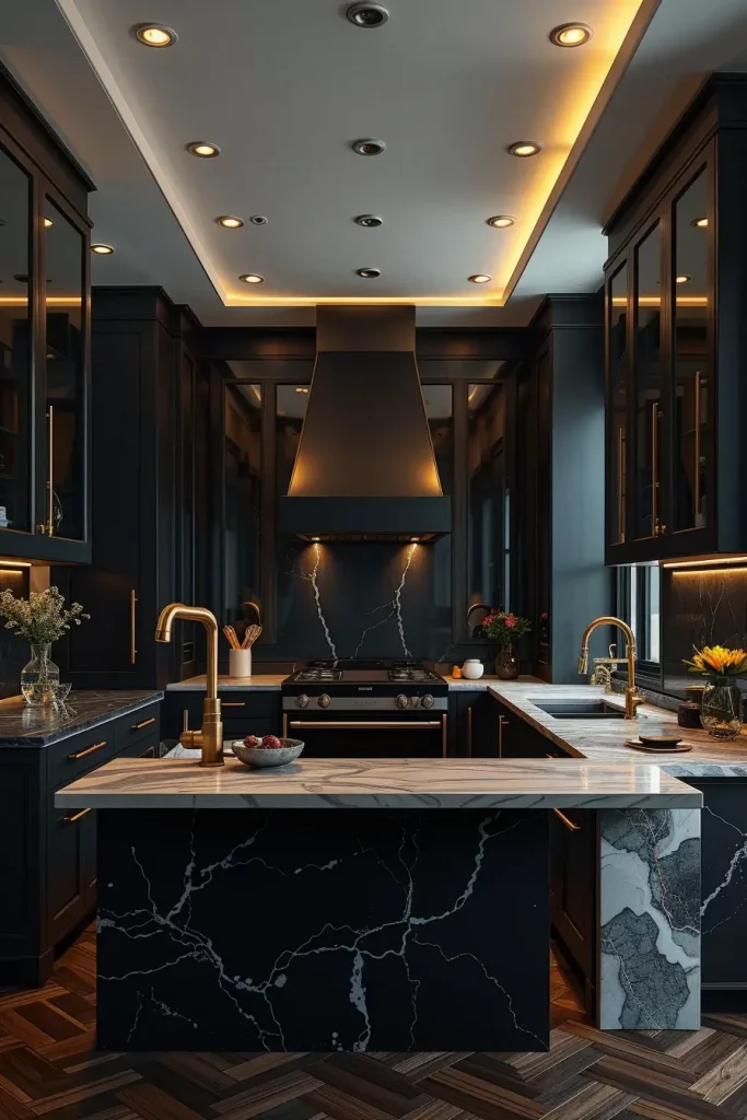 The main features are black marble islands, dark wood panels, LED strip lighting built-in to emphasize surfaces. The doors are made of smoked glass with fixtures made of brass to provide the luxury touch. Natural light, in this case, is very crucial, as it lowers the visual brightness of the dark finishes.