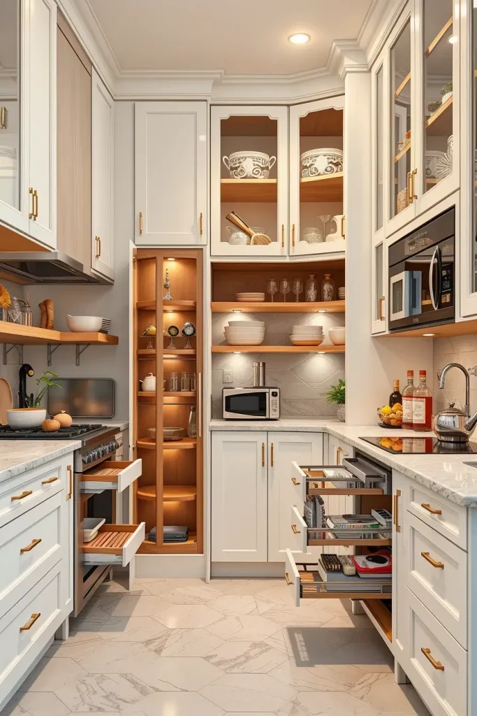 To be better, I would advise the corner pull-out storage systems or rotating shelving units to ensure that all corners of the room are utilized to maximum capacity.