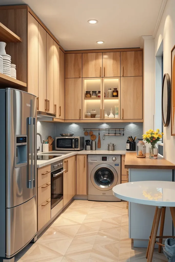 The options I would choose would consist of handleless cabinets, in-built appliances, and smooth countertops. To make it even more versatile, a movable island or a dining table may be placed facing the wall. The light colors, utilitarian design, and concealed storage are added to create a visual free space.