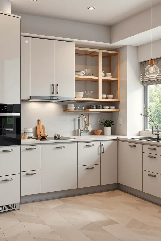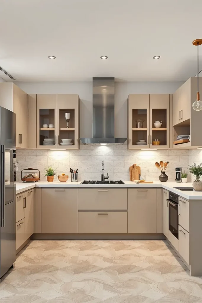In creating an L-shaped design, I would like to combine the use of tall cabinetry on one wall and open shelves on the opposite wall. Kitchen islands are usually the aesthetic focus, which provides additional seating and workstations. Cabinets with a tiled finish in neutral toned quartz, warm lighting, and comfortable lighting create a pleasant ambiance.